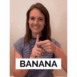 To sign BANANA, use your nondominant hand to “peel” the index finger of your dominant hand. Be sure you’re only peeling with your index finger and thumb, and that the other 3 fingers on your dominant hand are closed (not extended).