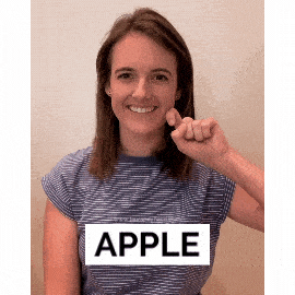To sign APPLE, bend the index finger of your dominant hand (this is the X handshape) and twist it twice at your cheek.